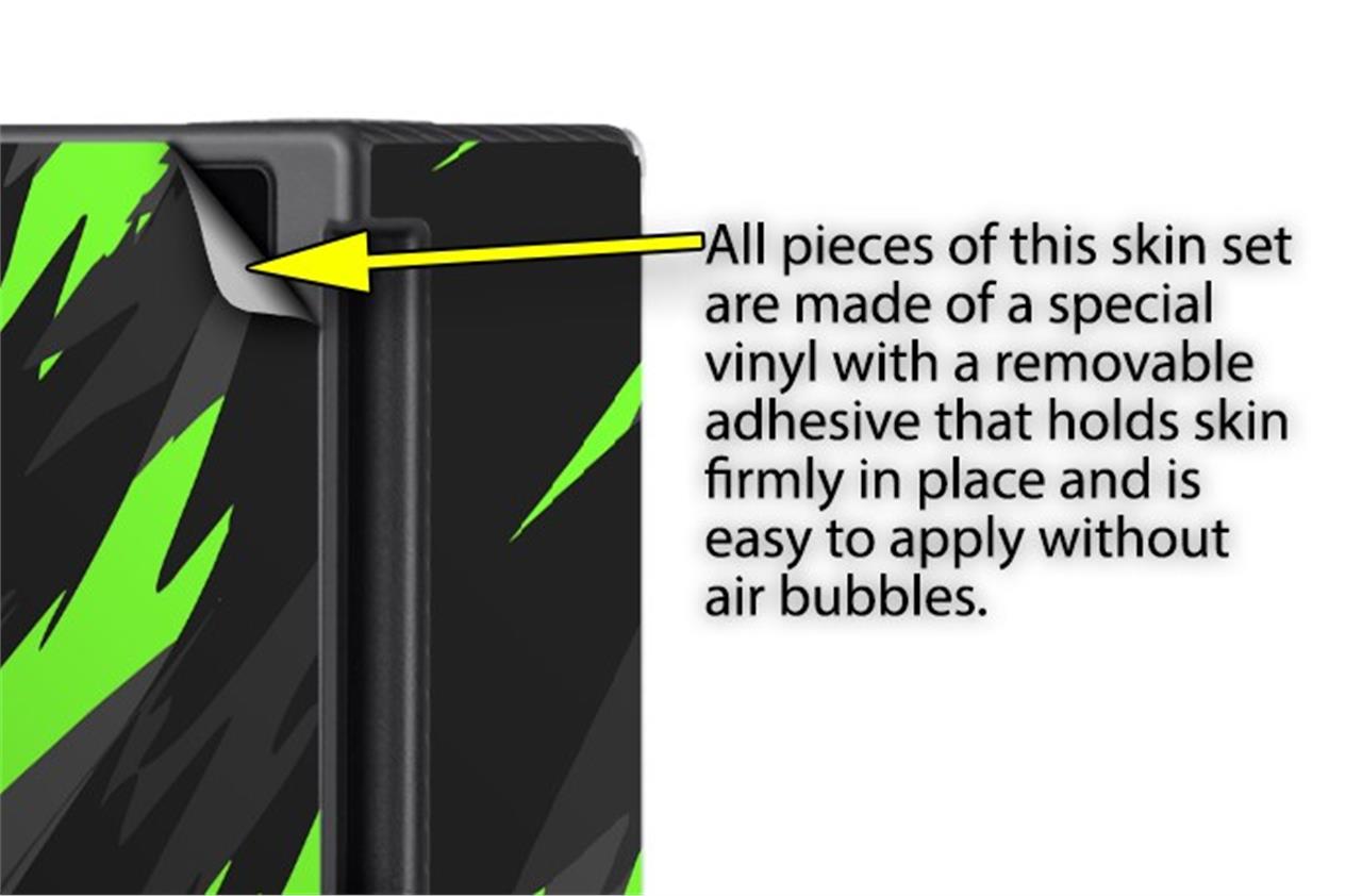 WraptorSkinz® skins are superb photo quality designs and vibrant colors printed with special Eco-Friendly, fade resistant inks. Our skins are self-adhering flexible vinyl skins that helps prevent scratches. Made of composite, multi-layered commercial grade materials. The bottom layer is made with a special removable adhesive that is easily positioned and applied without air bubbles. We print your design on the bottom layer then bond a professional grade laminate over the entire skin adding a glossy protective finish.