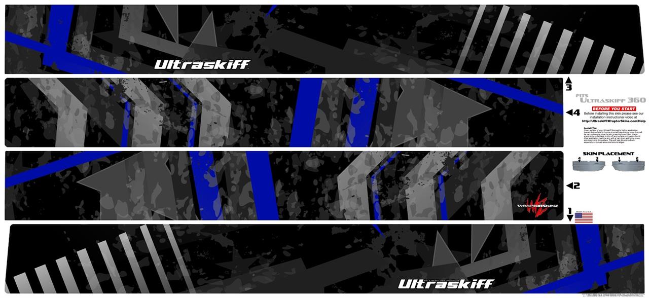 WraptorSkinz® skin wraps for Ultraskiff 360 are printed using superb photo quality designs and vibrant colors printed with special fade resistant inks that last even in direct sun for years. WraptorSkinz® are a composite of two layers of commercial grade materials. The bottom layer is a soft, flexible material with a special ultra-sticky adhesive designed to adhere to plastic body of the Ultraskiff. Next we print the bottom layer with UV protected, fade resistant inks that deliver superb photo quality designs in vibrant colors. Finally we bond a professional grade laminate over the entire skin adding a glossy protective finish.