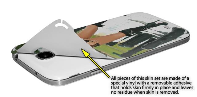 • Decal style vinyl skin covers front and back of Samsung Galaxy S4 phone.