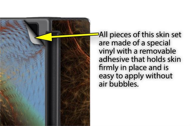 WraptoSkinz™ skins are superb photo quality designs and vibrant colors printed with special Eco-Friendly, fade resistant inks. Our skins are self-adhering flexible vinyl skins that helps prevent scratches. Made of composite, multi-layered commercial grade materials. The bottom layer is made with a special removable adhesive that is easily positioned and applied without air bubbles. We print your design on the bottom layer then bond a professional grade laminate over the entire skin adding a glossy protective finish.